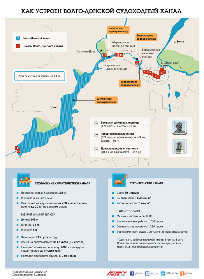 Волго-Донской судоходный канал имени Ленина, он же Волго-Дон. 96 гидротехнических сооружений, 13 шлюзов, три насосные станции, три водохранилища с плотинами, 17 дамб, гидроузел станицы Цимлянской с водохранилищем и еще двумя шлюзами, шесть поселков для работников, построенных с нуля…