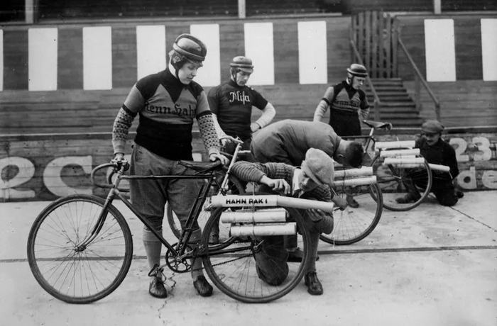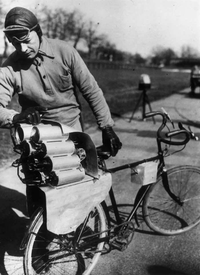 В 1931 году изобретатель не придумал ничего лучше, как присоединить к велосипеду 12 ракет и батарею для питания ракет.