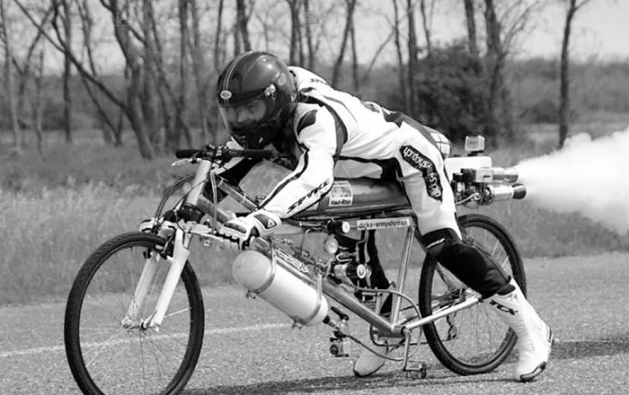 Его ракетный байк разогнался за 5 секунд до 333 километров в час. К мотоциклу прикреплялась ракета с концентрированной перекисью водорода. Этот разработку для француза выполнил швейцарский ученый.