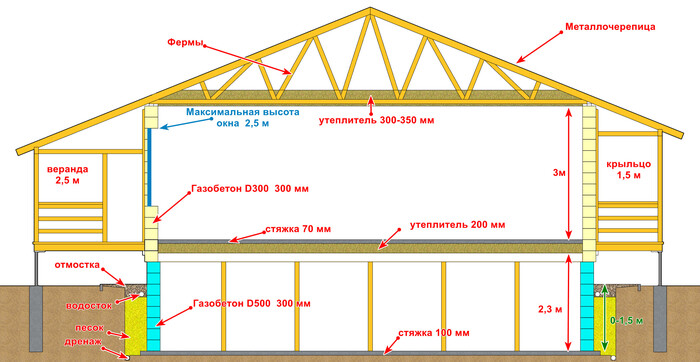 Эти два момента наложили достаточно серьёзные ограничения на выбор тех или иных решений. Например, та же крыша. В проекте это двухскатная кровля. Вальмовая или ломанная бы ли бы интереснее, но для неспециалиста значительно более сложные. Поэтому двухскатная.