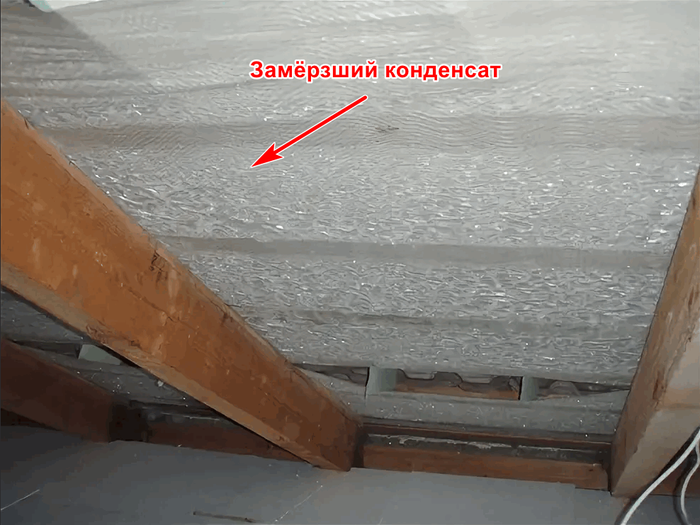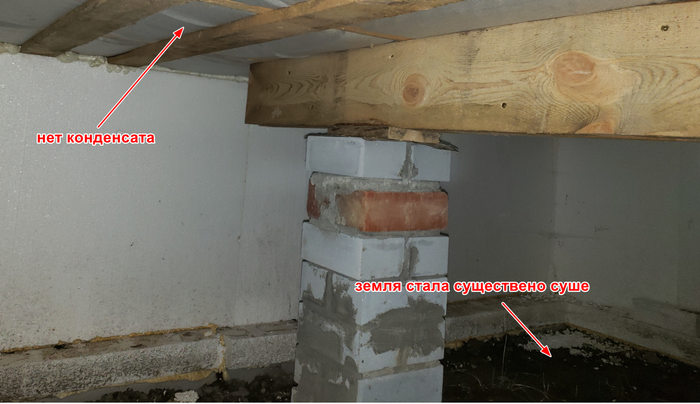 Тогда я в самые морозы ближе к концу февраля спустился в подпол бани и провёл натурные испытания. Причём влажность в самом подполе бани была весьма высока. Обратите внимание на конденсат на плёнке. (Это нормально для первого года пока земля в подполе не высохла)