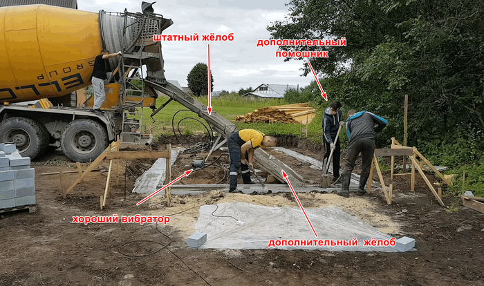 Тут основная сложность была в том, что прошли очень хорошие дожди и невозможно было подъехать на бетоновозе (стройка встала на неделю), а после того, как подсохло, заезд остался только с одной стороны. (вместо трёх) Пришлось собрать дополнительный жёлоб из всякого «мусора».