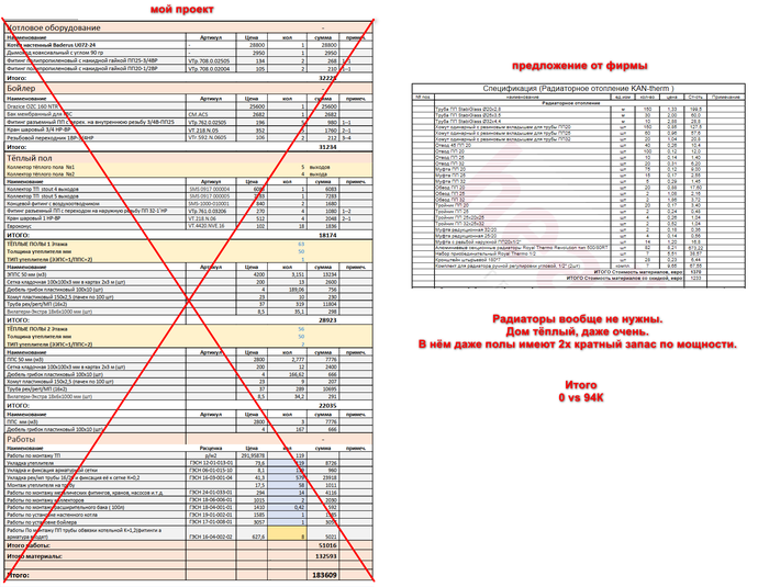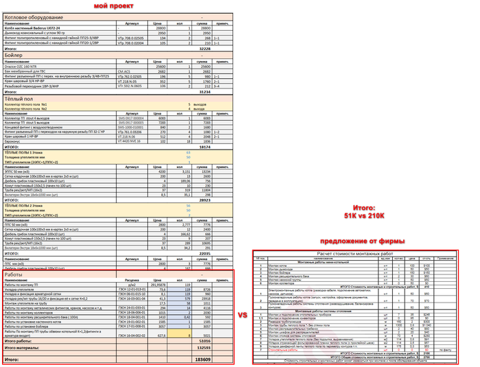 Вот пример сметы отопления одного и того же дома, выполненного радиаторами или тёплыми полами.