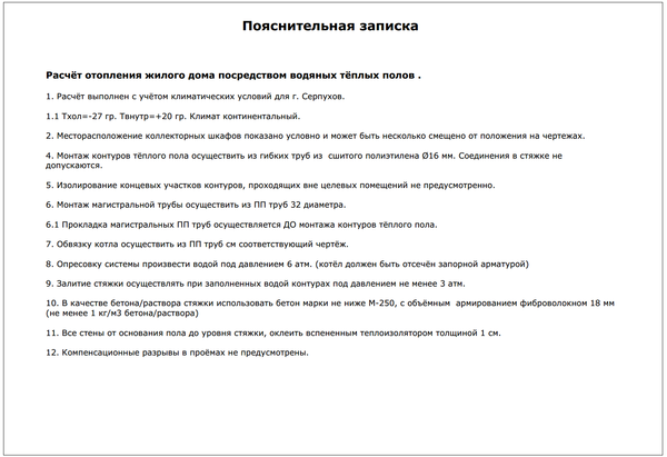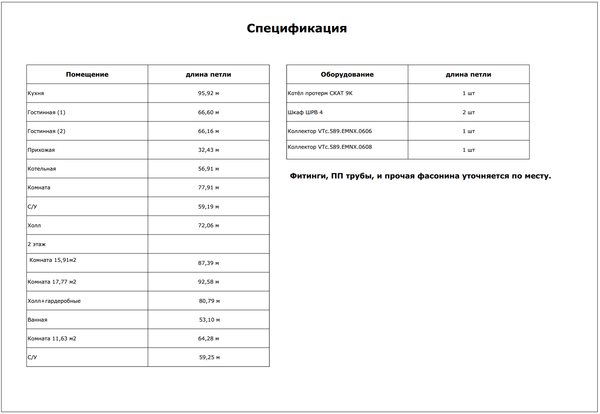 Спецификация. Почему не полная, почему нет: фитингов, фасонины, труб ? Нет смысла, вероятность того, что всё немного изменится 99%. Поэтому считается только то, что не подлежит изменению. Длины петель, мощность и тип котла, выходы коллекторов.