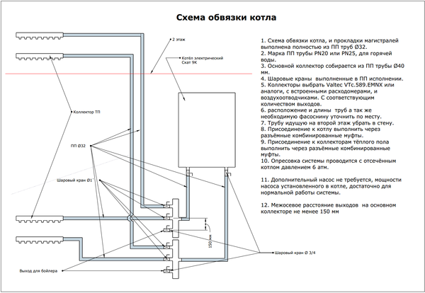 В данном случае получилось интересное решение, которое очень многих "мастеров" ставит в тупик. Всё отопление только полами и работает от одного насоса который стоит в котле. Ну и естественно никаких дополнительных батарей. Отсюда очень простой и дешёвый узел для обвязки котла.