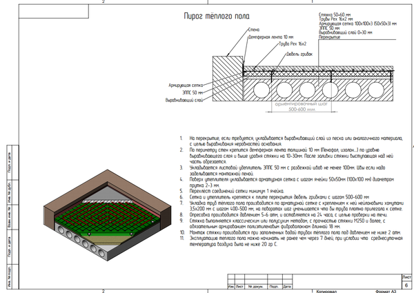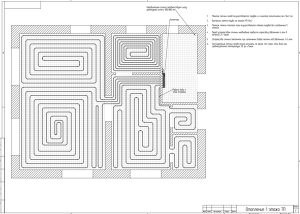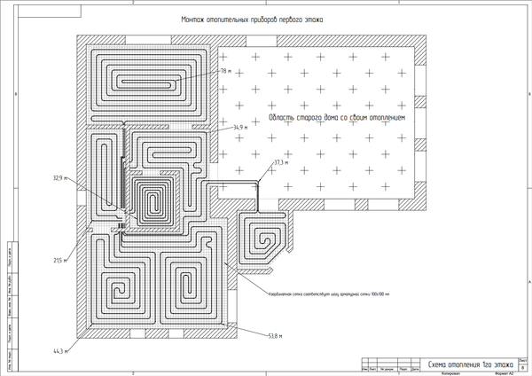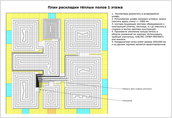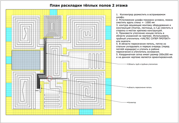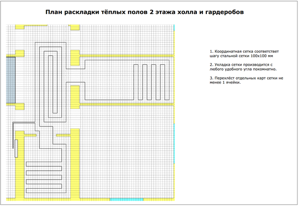 Есть ещё достаточно много листов с подробной раскладкой тёплого пола в каждой комнате, но остановлюсь на сложной раскладке. Здесь один контур греет сразу 3 помещения. Причём гардеробные (правое и нижнее) греются исходя из теплопотерь (не вся площадь), а холл с его крайне низкими теплопотерями (16 Вт/м2) греется серединой петли, и уложен улиткой.