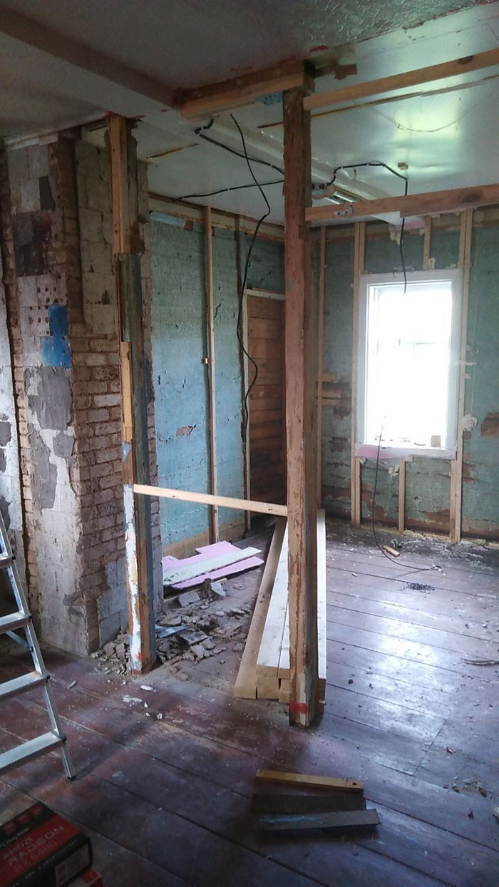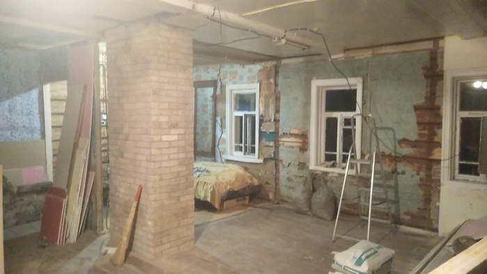 Когда поснимал ГКЛ внутри этой комнаты, принялся за разбор кирпичных перемычек от печки к перегородкам.