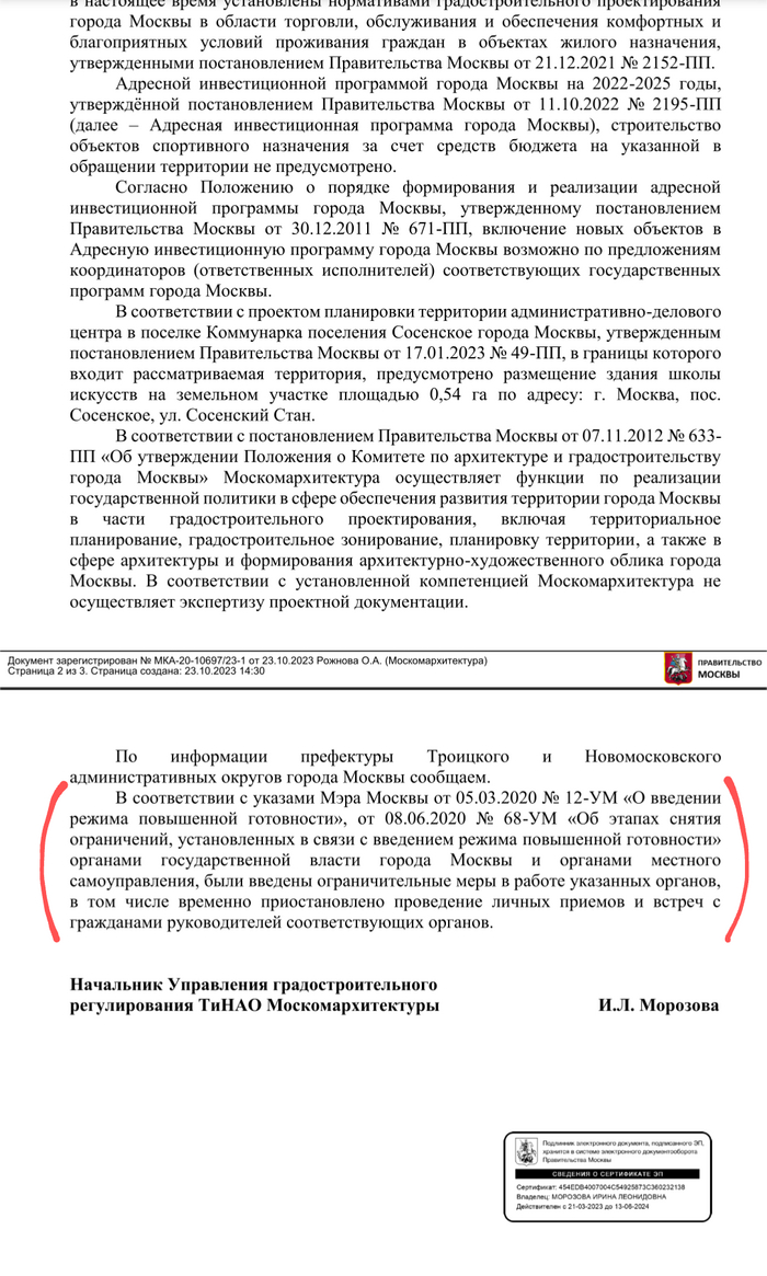 Однако власти Москвы не реагируют на обращения жителей, которые в феврале 2024 года собрали более 2600 подписей, которые были переданы в феврале 2024 года в Администрацию Президента РФ и Приемную Мэра Москвы С.С. Собянина, однако в ответ жители продолжают получать отписки.