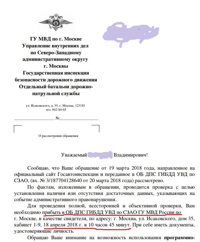 Помогло: вместо того, чтобы работать меня вызывают в отдел СЗАО ГИБДД в качестве свидетеля в рабочее время, просто поговорить...