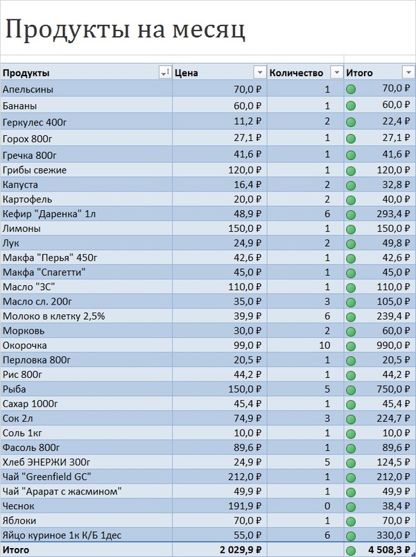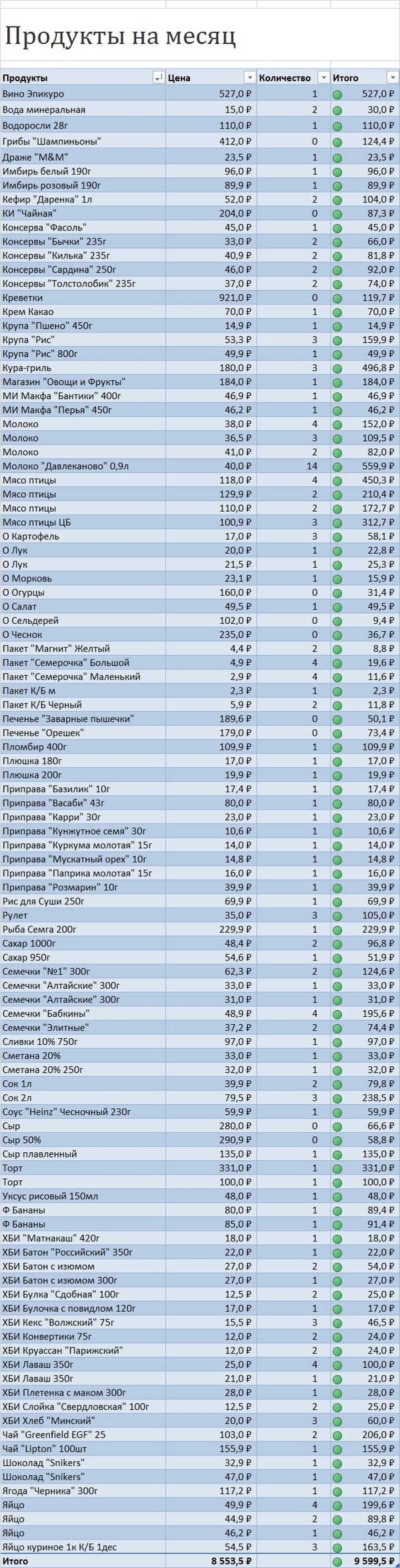 Это, тот список продуктов на месяц, к чему я стремился, дабы не двинуть кони и уложиться в бюджет 5к в месяц)