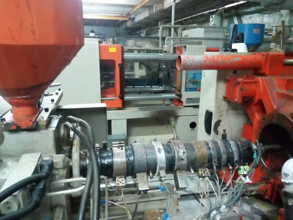 Из оранжевого резервуара в узел впрыска поступает материал,а именно гранулированный полипропилен, абс, резина и т.д. там он захватывается шнеком и проталкивается к соплу одновременно с этим нагреваясь до температуры плавления для полипропилена это 200-230 градусов. Кольца на узле это нагревательные элементы, они нагревают корпус шнека до нужной температуры. Во время забора материала (загрузки) шнек вращается и отходить назад, нагоняя между собой и отверстием сопла материал. После загрузки, машины готова к впрыску, во время впрыска, шнек сдвигается вперед выдавливая острым концом материал через сопло в форму и тот,в свою очередь, заполняет ее изнутри создавая изделие. Дальше изделие насколько секунд остывает в форме (кристаллизуется), форма раскрывается и изделие выталкивается из формы, способов изъятия изделия из формы множество от жесткого выталкивателя, до воздушных клапанов и плит съема.