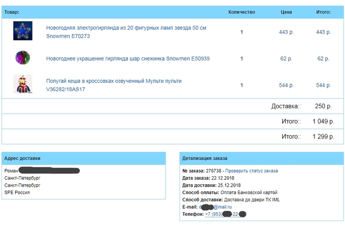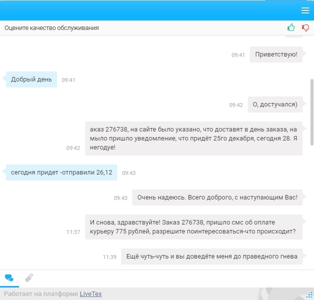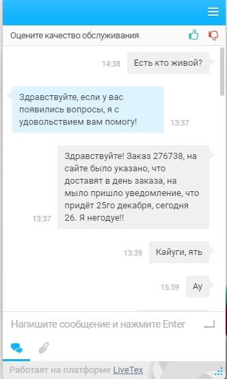 Говно вопрос-подумал я, сделаю небольшой подарок в преддверии нового года. В магазинах не нашёл, начал рыть интернет в поисках крылатого, везде доставка долгая, а хотелось побыстрее, и наткнулся я на "замечательный" сайт, о котором говорил выше. Он обещал доставку в тот же день, т.е. 22 декабря (Товарищи энергетики, с прошедшим!), но надо в корзину доложить какой-нибудь херни чтоб было больше 1000 рублей, ибо с меньшими суммами они не работают. Ну я по быстрому всё оформил, заказал, оплатил, подождал звонка от менеджера и сижу жду. Тут приходит письмо на мыло, что заказ будет доставлен 25го числа!