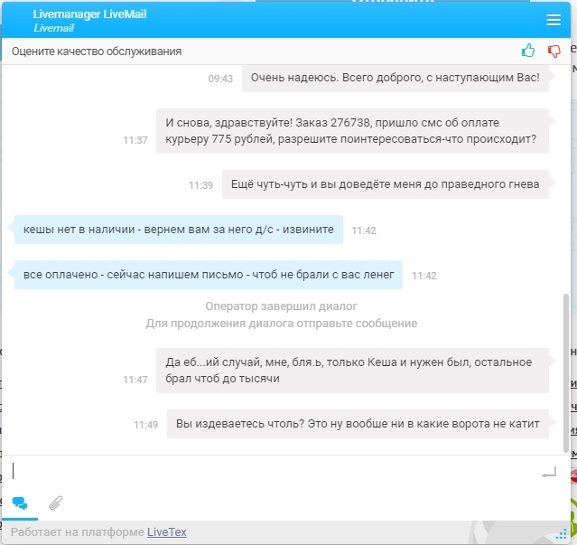 Ах, да, ещё пришло смс мол товар передан в курьерскую службу и извольте им накинуть 775 рублей. Хотя за доставку они деньги снимают при заказе товара. Я задаю им резонный вопрос см. выше и тут меня просто добивают