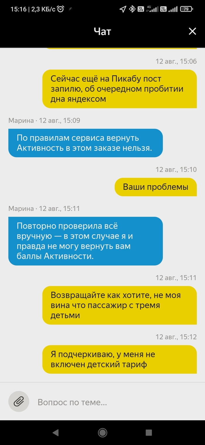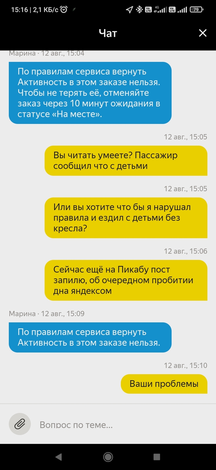 Сегодня прилетает заказ, пассажир с тремя детьми, пришлось отменить заказ, а в Яндексе при отмене заказа самим водителем снимается активность