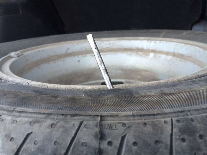 Отвертка прошла насквозь через протектор и вышла в боковину на внутреннюю сторону...
