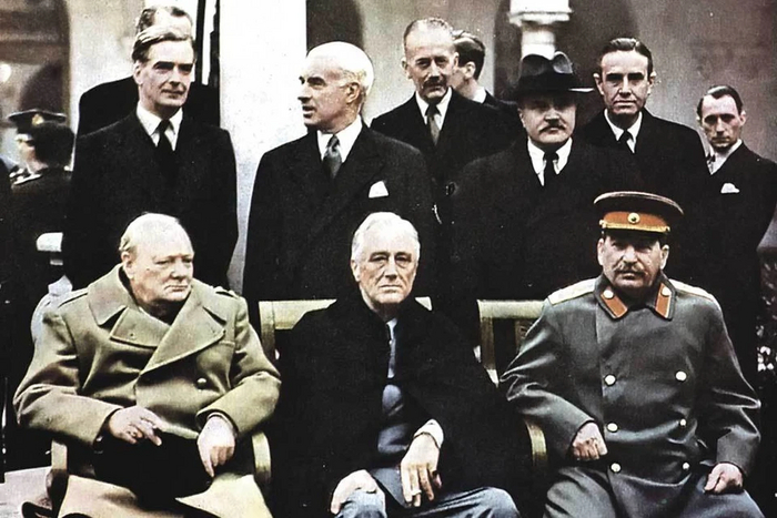 Сталин, Рузвельт, Черчилль на Ялтинской конференции в феврале 1945 г.
