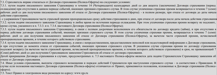 Конкретно, в п.7.3 и далее указано, что теперь возврат возможен только: в период охлаждения 14 дней, при полном закрытии кредита досрочно. Хотя в п. 7.3.1 говорится, что возможен возврат с удержанием Страховщиком части страховой премии пропорционально сроку действия страхования в днях, при отказе от договора после даты начала действия страхования.