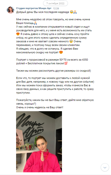 Однажды заказывала портрет от данной студии. Видимо, все настолько плохо с идеями, что вот уже полгода ребята пытаются развести клиентов на повторную покупку исключительно через жалость...