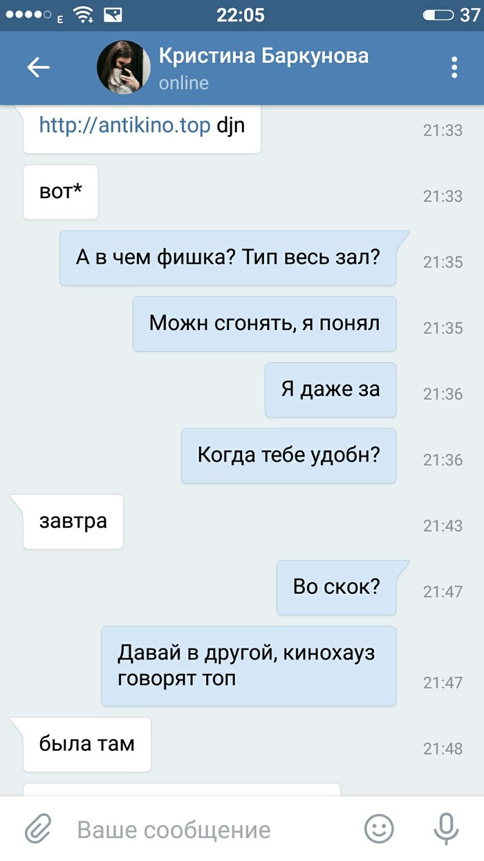Кидает ссылку на свой кинотеатр, сообщая, что у конкурентов кинотеатр намного хуже.