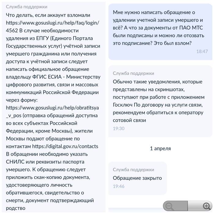Параллельно пыталась выяснить на Госуслугах, каким образом отменить создание этой электронной подписи и удалить папину учетку. На горячей линии естественно робот, который ничем помочь не может, а вот в чате оператор мне ответил.