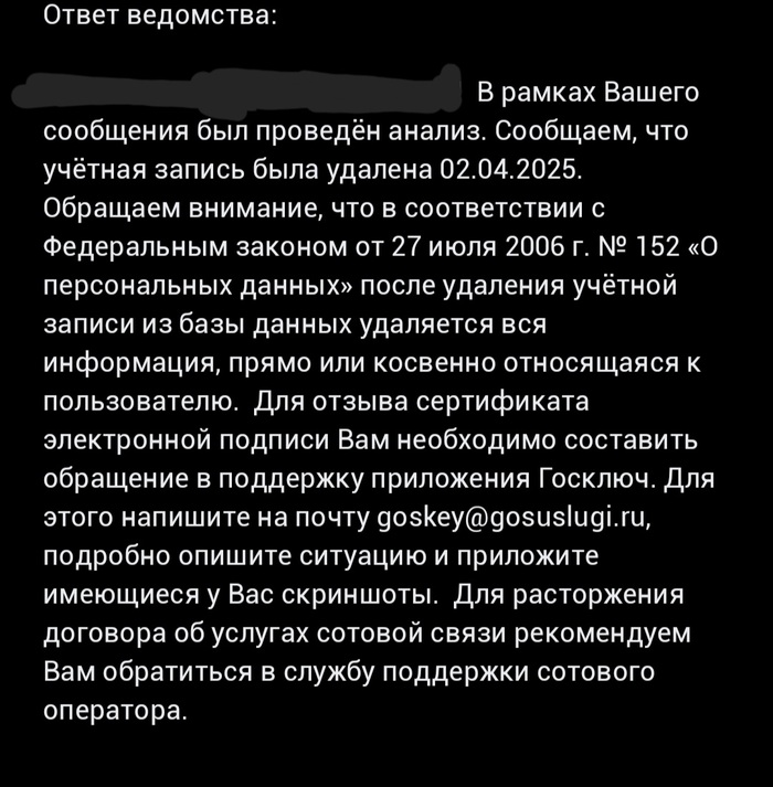 5 апреля пришел ответ, что учетная запись на Госуслугах была удалена 2 апреля.