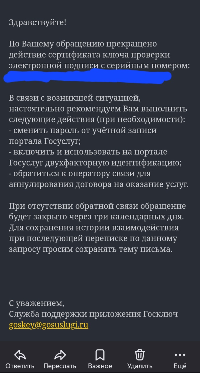 Но и это не конец, теперь нужно снова описать ситуацию и отправить все документы на почту сервиса Госключ. И через три дня, после отправки сообщения, наконец-то действие ключа электронной подписи было прекращено. Но подписанные договора аннулировать ни Госуслуги, ни Госключ, конечно, не могут и снова отправляют к операторам связи. Ну и рекомендуют сменить пароль от Госуслуг и включить двухфакторную идентификацию (к удаленной учетке умершего человека, ага).