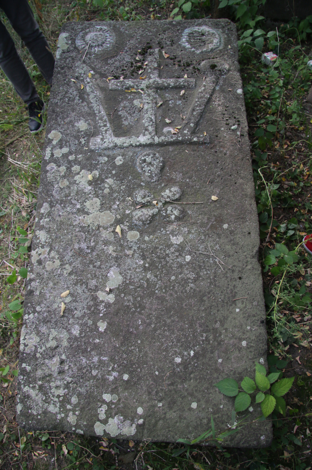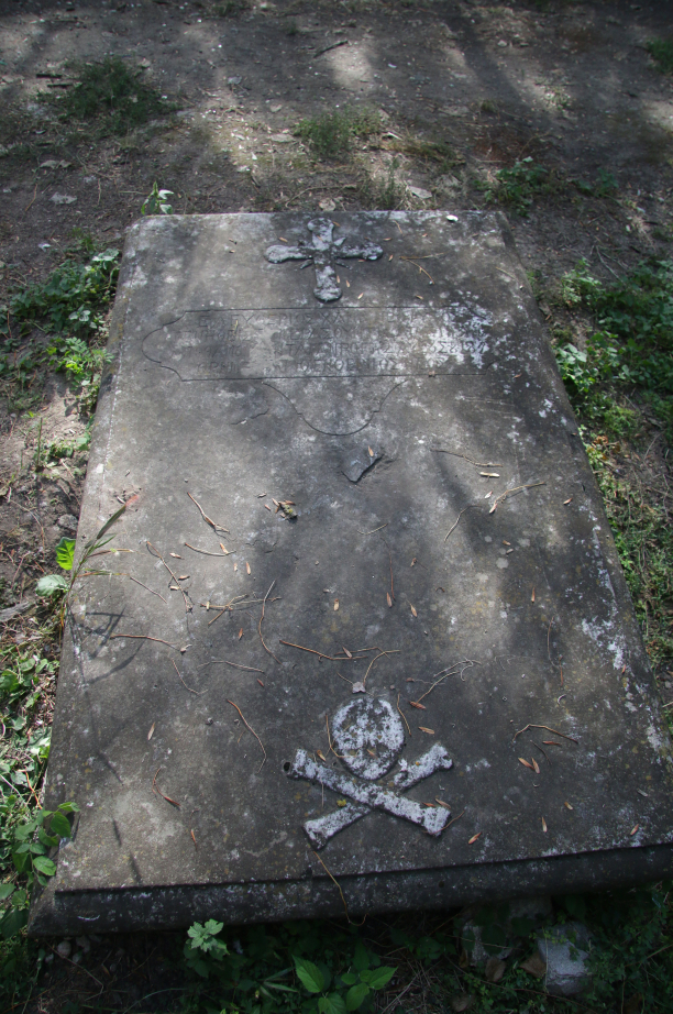 Необычное для нашего кладбища надгробие в виде лежачего креста на бетонной основе внутри мраморного бордюра. По граням и креста, и бордюра нанесены надписи на английском языке. Автором сайта этот памятник был замечен еще в 2009 году, но полноценно восстановить эпитафию не представлялось возможным из-за замусоренности участка, очистка которого недавно начата силами реставратора Владимира В. из кладбищенского храма. Та грань, на которой нанесено имя, была затянута мхом, как видно из фотографий 2009 года, и имеет застаревшие повреждения, как видно после очистки. Тем не менее, сохранившихся букв достаточно, чтобы утверждать, что перед нами могила крупного английского купца Джона Емеса (John Yeames).