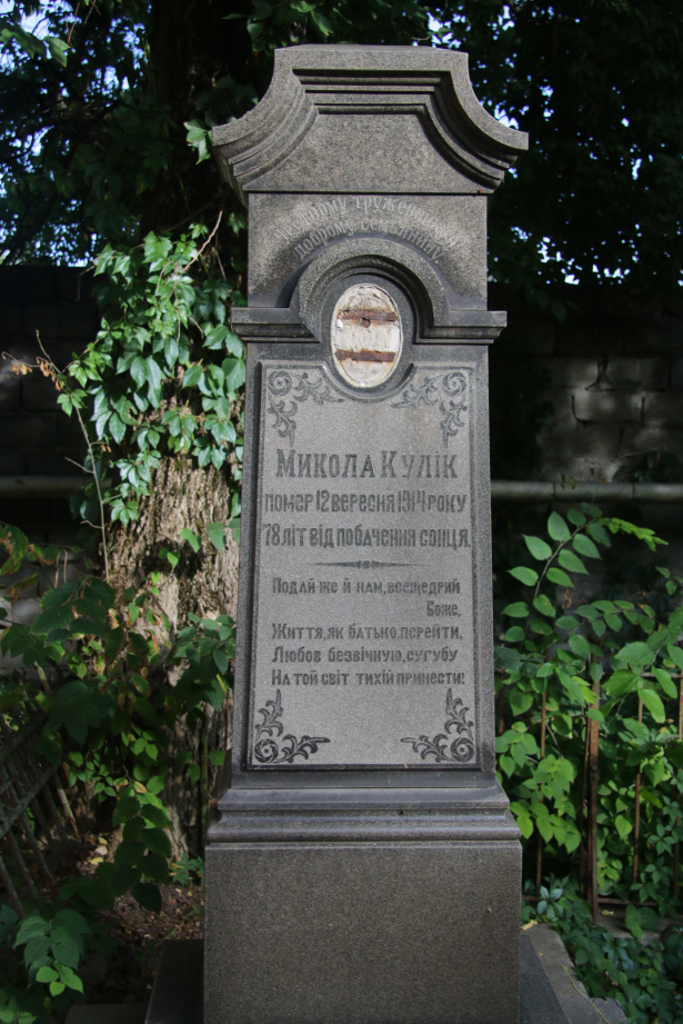 Высокий гранитный памятник с эпитафией на украинском языке. Фотография утрачена, крест утрачен.