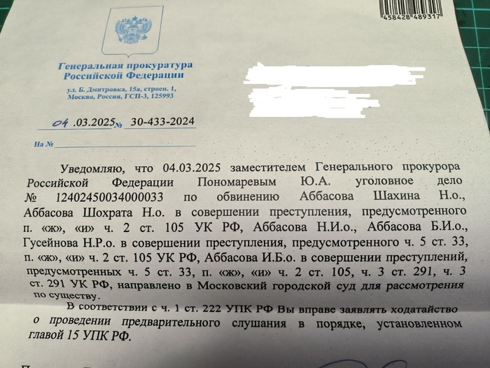 Завтра, 16.08.2024 в 09:30 Московском городском суде по адресу Москва, Богородский вал, дом 8 Зал 422 (Основное здание) состоится рассмотрение апелляционной жалобы обвиняемых на решение Басманного районного суда о продлении срока содержания под стражей для арестованных по делу убийства Кирилла Ковалева (Аббасов Б.И.О. (Ст. 105, Ч. 2, п. ж), Аббасов И.Б.О. (Ст. 105, Ч. 2, п. ж), Аббасов Н.И.О. (Ст. 105, Ч. 2, п. ж), Аббасов Ш.Н.О. (Ст. 105, Ч. 2, п. ж), Аббасов Ш.Н.О. (Ст. 105, Ч. 2, п. ж), Гусейнов Н.Р.О. (Ст. 105, Ч. 2, п. ж)). Уникальный идентификатор дела - 77RS0002-02-2024-011210-18.