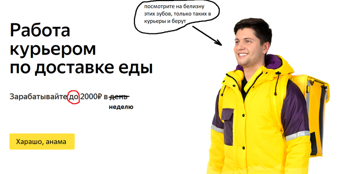 - Оператор: В случае опоздания к клиенту, вам будет предъявлен штраф, в размере вашей недельной выручки 1000 рублей. Напоминаю вам детали заказа: забрать из отделения ближайшего макдональдса (2 самых дешевых бургера и салат по акции. Да, Яндекс Еду заказывают такие же бомжи как и ты, уважаемый читатель) и привезти на метро ВДНХ по адресу (вставьте сюда любой адрес, находящийся в 20 км от метро ВДНХ) через 6 минут.