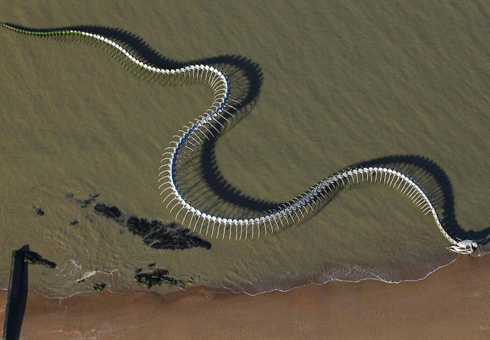Скелет длиной в 130 метров выполнен из алюминия и ужасно реалистичен. Кажется, будто он выходит из морской пучины. Извилистое движение его позвонков создает иллюзию живого существа, как будто он хочет подняться из вод океана, чтобы появиться и исчезнуть в ритмах прилива.