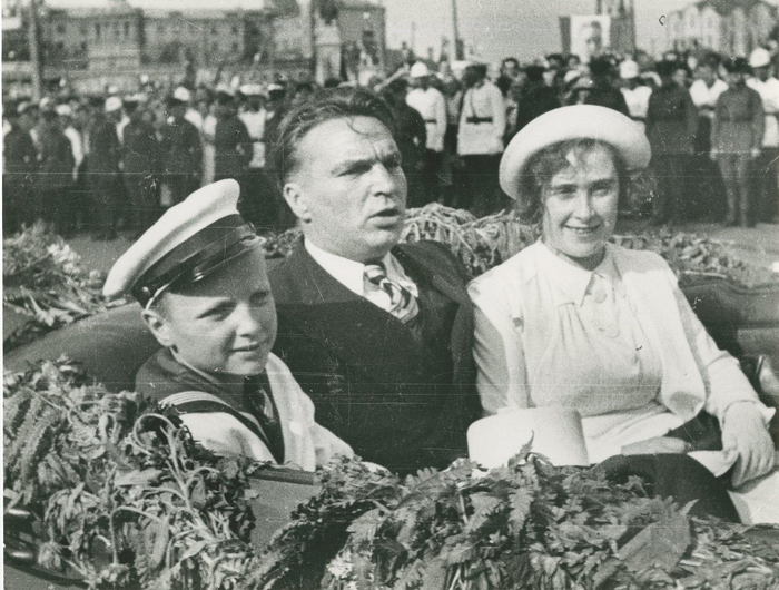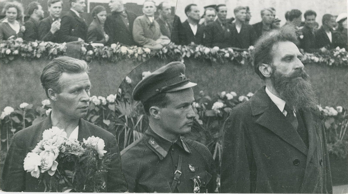 1934. О.Ю. Шмидт и первые Герои Советского Союза летчики В.С. Молоков и Н.П. Каманин на встрече челюскинцев