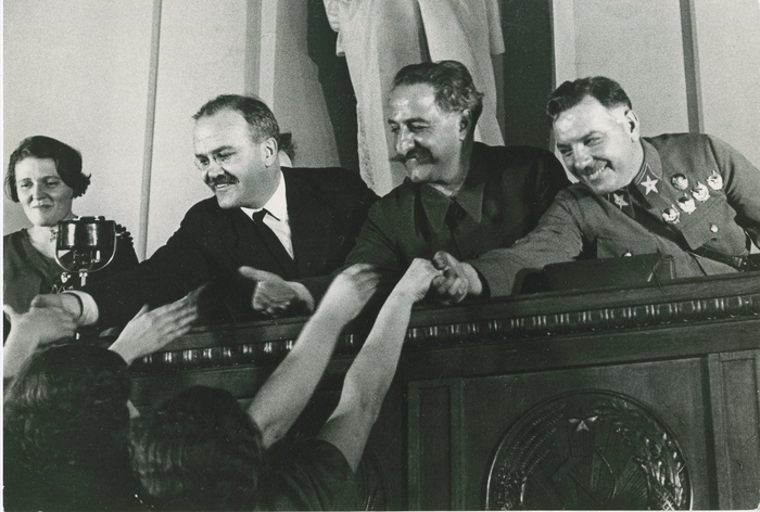 1936. Серго Орджоникидзе, К.Е. Ворошилов и В.М. Молотов на совещании жен командиров в Кремле