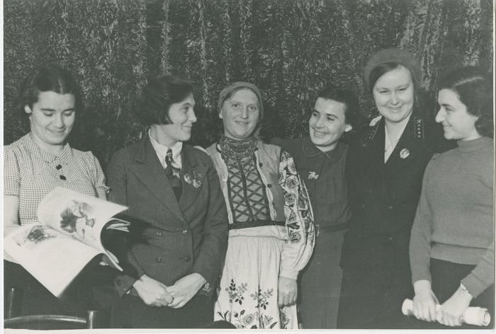 1936. Знатная трактористка Прасковья Ангелина (2-я слева) в перерыве совещания в ЦК ВЛКСМ. 14 июля