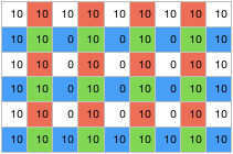 Смотрите, что сделали Samsung для S20 Ultra, они поставили матрицу 108Мп, но она работает по умолчанию в режиме 12Мп, потому что группы 3х3 пикселя (как обычно накрытых цветными фильтрами) работают как один пиксель да и накрыты они фильтром одного цвета: 3х3 зелёных, 3х3 красных и так далее. Вот как выглядел бы пример на такой матрице из начала поста: