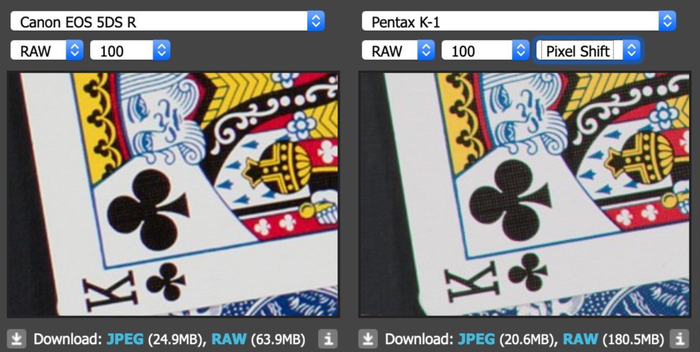 Благодаря pixel-shift различима сеточка — мельчайшая структура поверхности игральной карты (особенно хорошо видно в черных и синих заливках). Каждый пиксель работает как полноценный пиксель. Слева — не полноценные пиксели, там нет столько деталей, сколько есть пикселей.