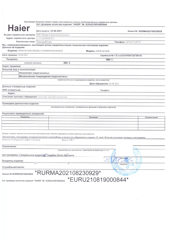 Претензия в Haier по горячей линии была оставлена в тот же день, в магазин – следующим утром, 20 августа. Ответ магазина: сначала сервисный центр должен составить акт о неисправности, только потом МВидео заберут неисправную машинку, после доставки машинки в магазин будет решаться вопрос о замене товара или возврате денег. Ну ок, значит, такая система.