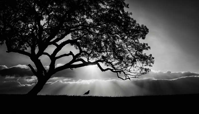 В размытом фоне закатного неба, среди тихой и спокойной природы, выделяется силуэт одинокого дерева. Его стройные линии и изящная композиция создают атмосферу уединения и покоя. В этом минималистичном черно-белом фото воплощается настроение загадочности и трансцендентности.