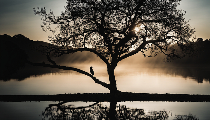 Величественный силуэт дерева у водоема представляет собой идеальное сочетание природы и покоя. Этот минималистичный ландшафт создает атмосферу гармонии, в которой можно полностью расслабиться и насладиться миром вокруг.