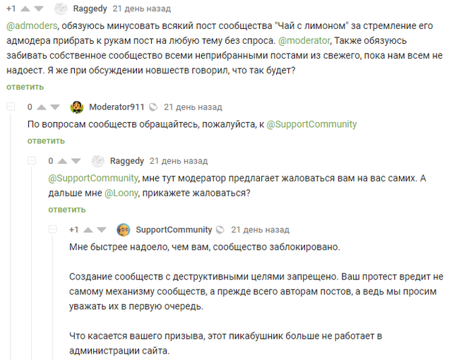 @moderator, @SupportCommunity, Объясните пожалуйста почему произошла эта ситуация #comment_200818588 Что за двойные стандарты? Почему человек решил поступать так же как @tutuskania и ему в тот же день заблокировали сообщество, а в отношении вышеупомянутой Дамы с вашей стороны не производится никаких действий не смотря на поток жалоб на протяжении более месяца.