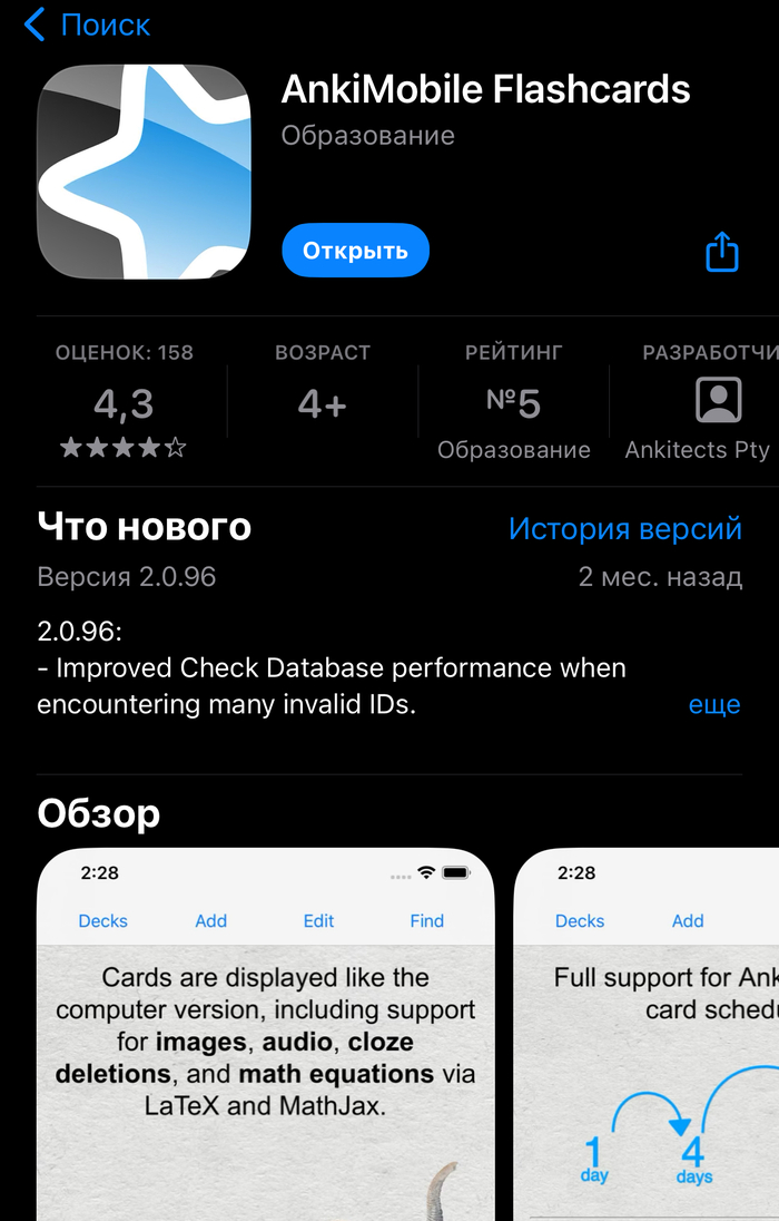 2) Anki - приложение на основе интервального повторения. Оно автоматически определяет, когда и как часто показывать вам карточки для повторения. Выучили слово сегодня, программа покажет его еще завтра, потом через 3 дня, потом через 5, и так в прогрессии