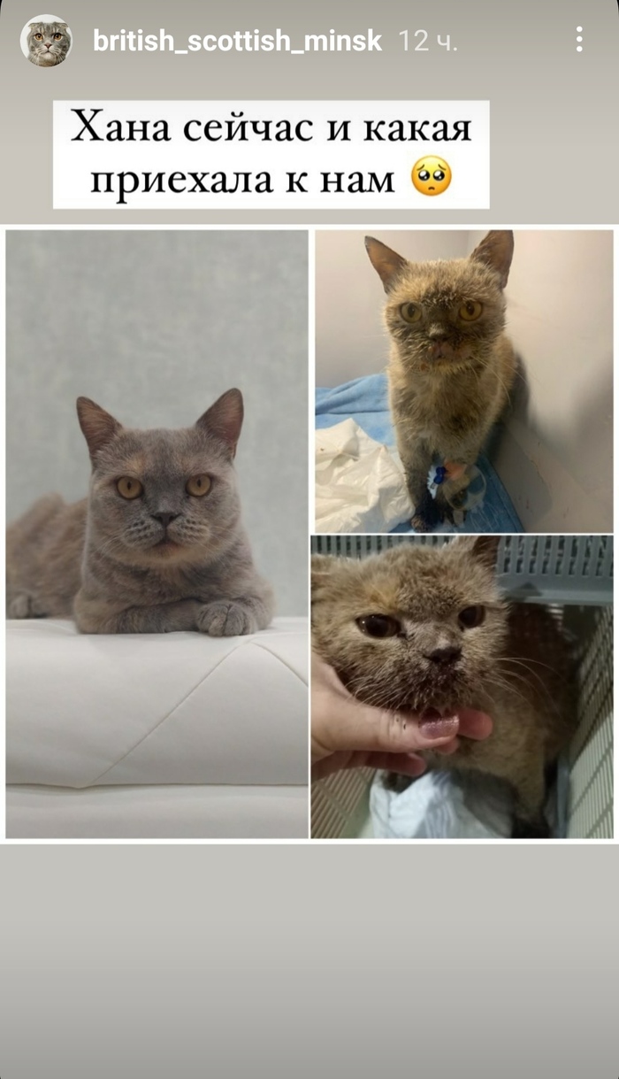Хана была подобрана очень больной, находящейся при смерти: она была больна кальцивирозом и беременной. Плоды уже погибли и отравляли ее. Ее подобрали, передали «группе поддержки британским и шотландским котам», спасли, вылечили, хоть и было мало шансов, но справились.