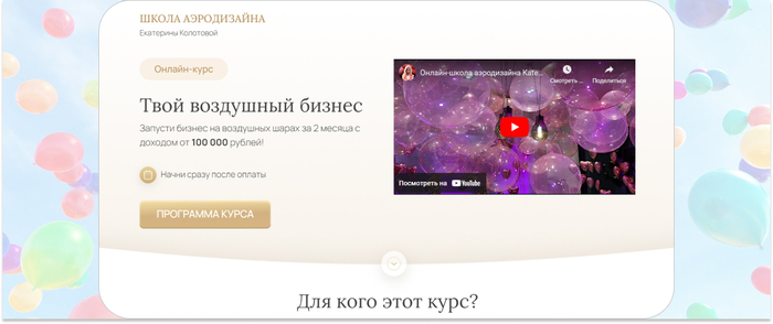 Курс предназначен для изучения основ аэродизайна. Во время прохождения курса вы научитесь обустраивать свое рабочее место и правильно подбирать оборудование для работы. Вы узнаете все тонкости декорирования воздушными шарами. А еще поймете, как сэкономить без ущерба качеству.