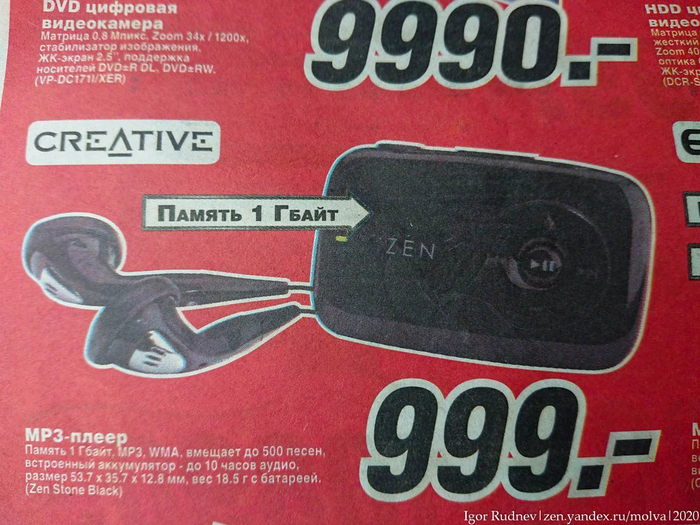 А чего стоят МP3 плейеры? Это сейчас телефон в кармане, беспроводные наушники в ушах и пошел на работу. А раньше нужна была вот такая коробочка, в которую входил ровно один гигабайт скачанных без регистрации и смс песен. Даже в характеристиках написано: "вмешает до 500 песен".