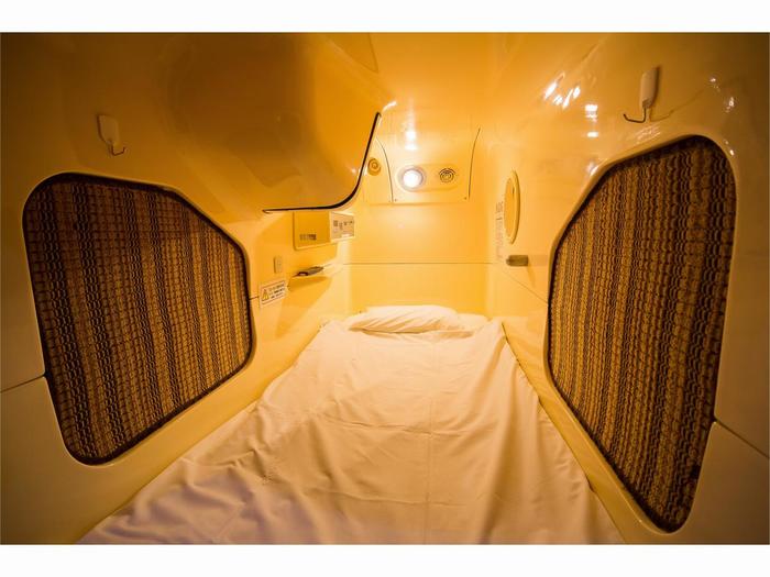 В самой капсуле есть зеркало, радио, тв, будильник и халат (юката), помимо постельных принадлежностей.