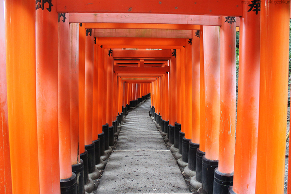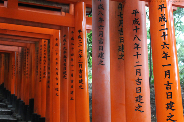 Прибыв утром в Киото, мы отправились в Fushimi Inari Taisha. Главный планировщик поездки говорил, что в этом храме надо будет подниматься в гору. Надо сказать, что каждый день мы проходили минимум 20км пешком, но подъем в гору все же оказался для многих из нас трудным, так как занял чуть больше часа. Очень выматывает. Весь же путь вверх по горе стоят ворота Тории, которых аж 10,000 судя по одному из названий этого храмового комплекса.