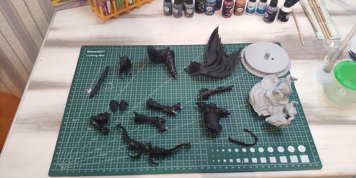 По прошлому опыту самым верным решением перед покрасом было загрунтовать именно в черный цвет, так как с него проще всего делать камень для подставки. На нем и остановился