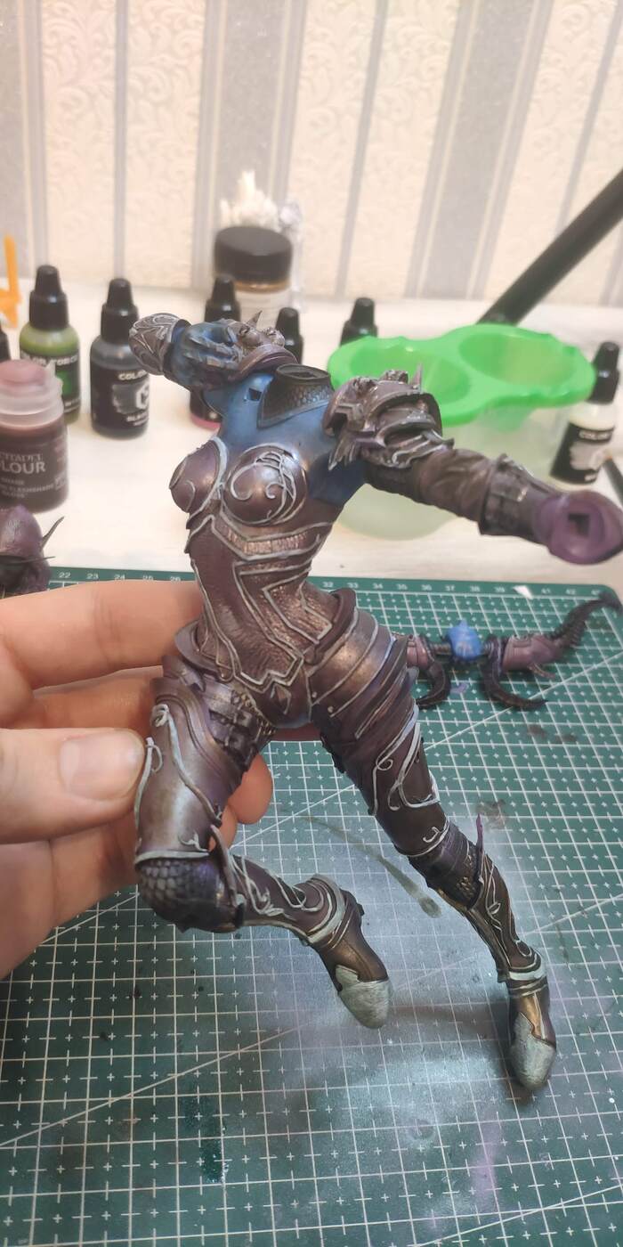 Все места где залез на другие части будут в последующем исправлены с помощью кисти. После базового слоя все пролил проливкой от GW и начал покрывать уже кистью металлический слой. После металла нанес первые выделяющие части голубой краской. Очень долго выбирал между серебром золотом или голубой и остановился на последнем, так как контраст смотрелся гораздо лучше.