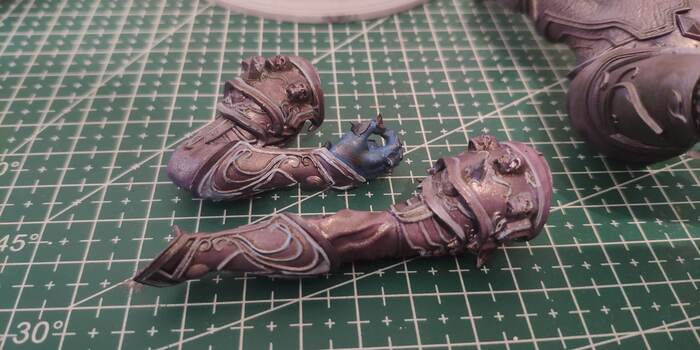 Как только все окончательно высохло можно было приступать к окрашиванию. Исходя из размеров деталей было проще всего красить из аэрографа, так как большие площади кистью красить сложновато. Начал с руки робота, что бы после уже отталкиваться от нее с цветами. Все таки самая большая часть модели. Покрывал серым как базу, после металлик (сталь) и далее уже фиолетовые пятна от окисления метала.
