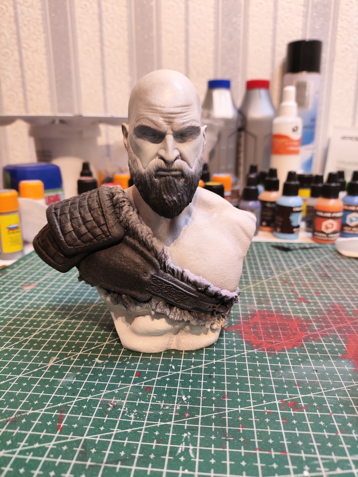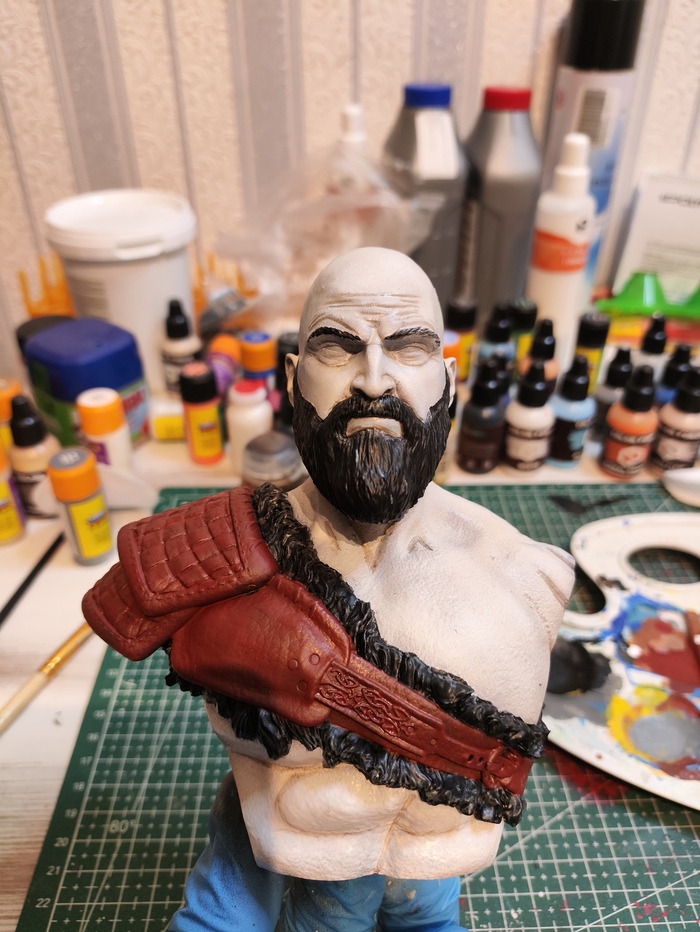 Дальше постепенно высветляем кожу. В итоге я выбрал более белый оттенок каким кратос был в первых частях. Кожу задуваю через аэрограф. После покрываю черным слоем бороду и повязку, что бы начать с ними работать